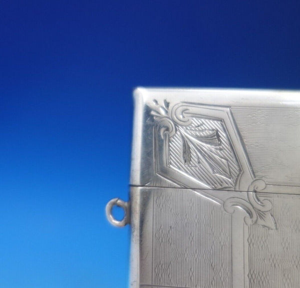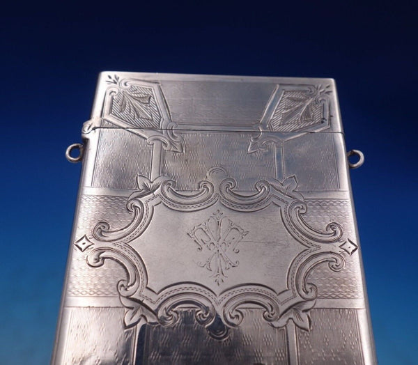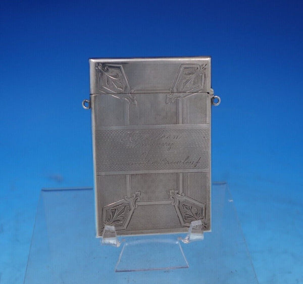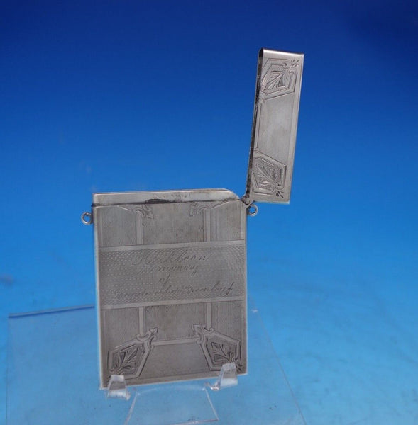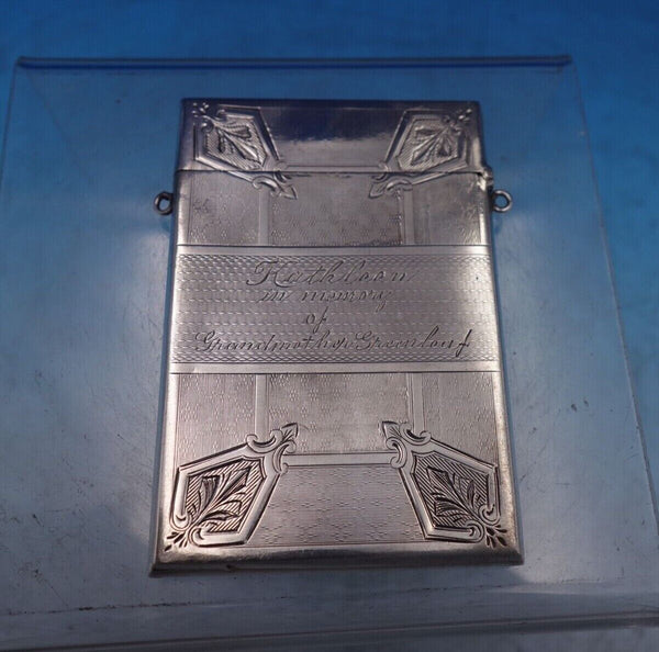 Remarkable Albert Coles coin silver card case engine turned and hand engraved with loops for hanging marked #225. This piece measures 3 3/4" x 2 1/2" and weighs 2 troy ounces. It has an inscription on one side "Kathleen in memory of Grandmother Greenleaf" and a design on the other (see photos), and is in good vintage condition. Amazing!