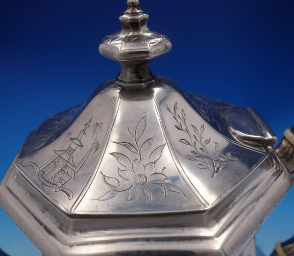 Extraordinary Gelston and Treadwell of New York coin silver tea pot bright-cut with Japanesque motifs including a pagoda building and flowers. This piece measures 9 1/2" tall x 9" and weighs 26.3 troy ounces. It has a vintage monogram and family crest (see photos) and is in good vintage condition. Superb! Note: See the matching sugar bowl SKU#3930.