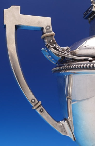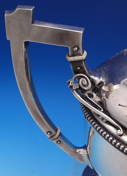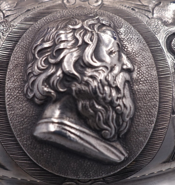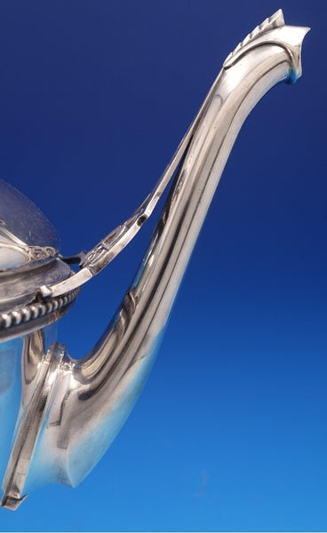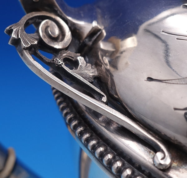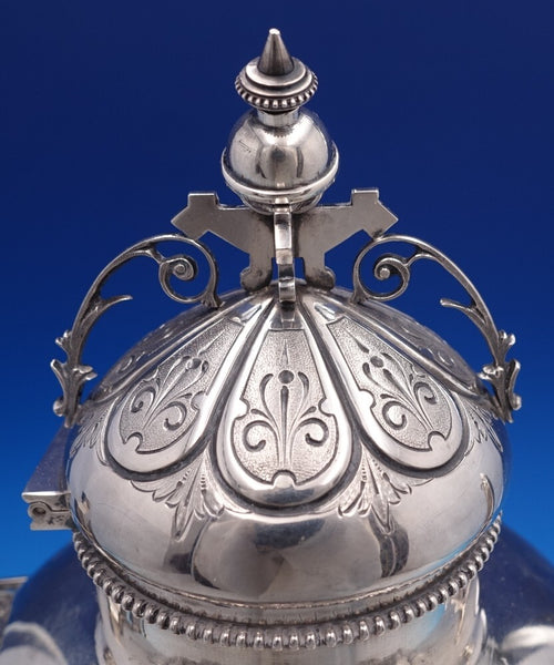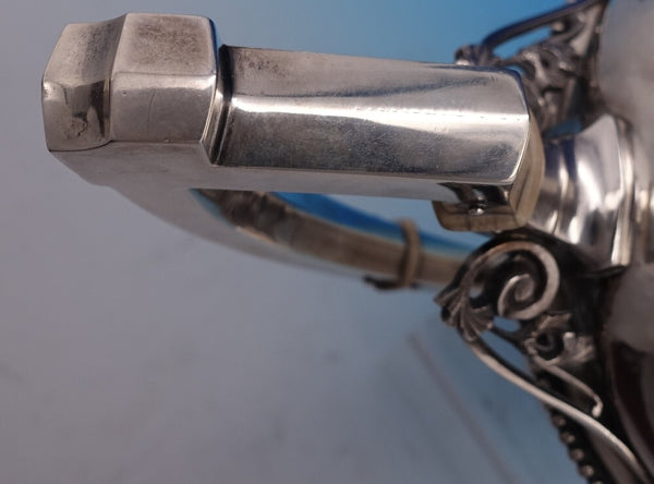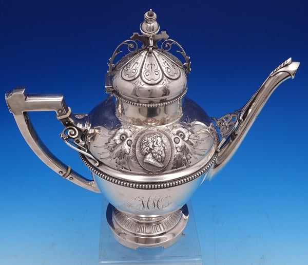 Extraordinary Medallion by Wood and Hughes 900/1000 coin silver Coffee Pot with bright-cut and applied wirework detail around the finial, spout, and handle. There is a large high relief medallion surrounded by repoussed floral designs. It is monogrammed as shown and is in excellent vintage condition. It measures 12 W (spout to handle) x 11" tall and weighs 34.6 troy ounces. A work of art.