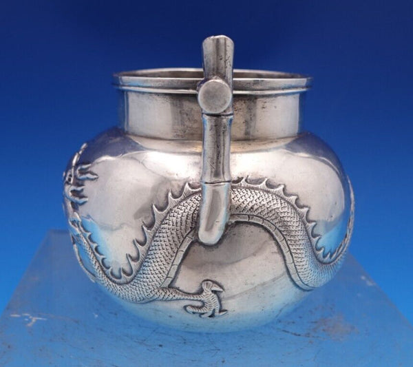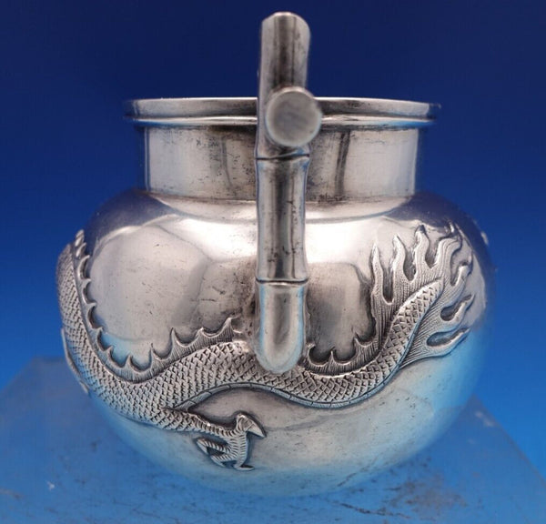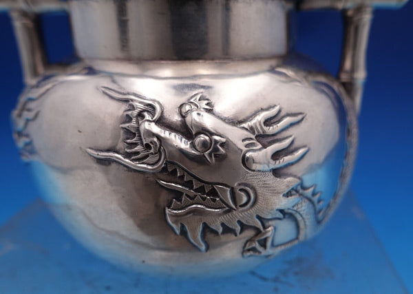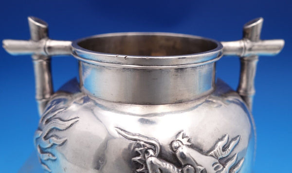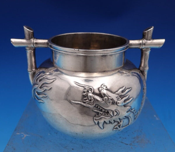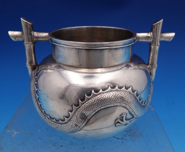 Extraordinary Hung Chong Chinese Export sterling silver sugar bowl made in Canton and Shanghai, circa 1860-1930. This sugar bowl features a wonderful repoussed large dragon and a bamboo form double handle. It measures 3 1/4" tall x 4 1/4" and weighs 5.4 troy ounces. It is not monogrammed and is in good estate condition. Note: Being offered as-is with some dents. Lovely piece!