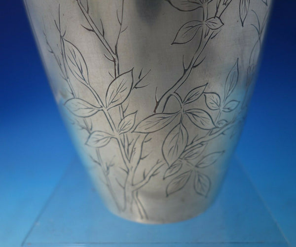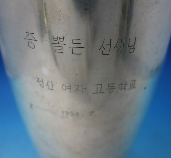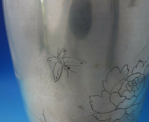 Exceptional Japanese .950 silver vase with bright-cut chrysanthemum and butterfly (maker unknown). This piece measures 10 3/8" tall x 4" and weighs 25.3 troy ounces. It has an inscription with symbols and date (see photos), and is in good vintage condition. Gorgeous!