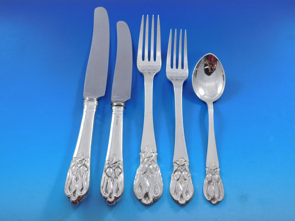 Rare Blossom by Carl Poul Petersen (Canada) sterling silver Flatware set - 40 pieces. This unique pattern is similar in style to handmade ornamental Georg Jensen silver, with Art Nouveau design elements and a subtle hand hammered finish. This set includes: