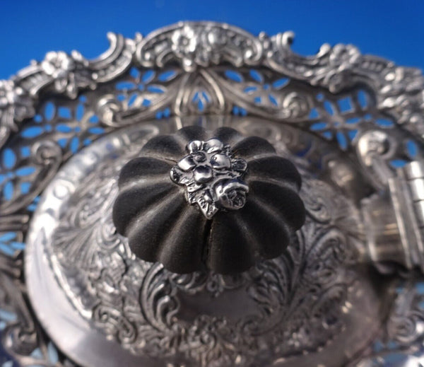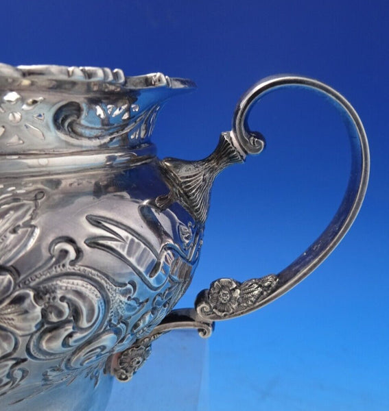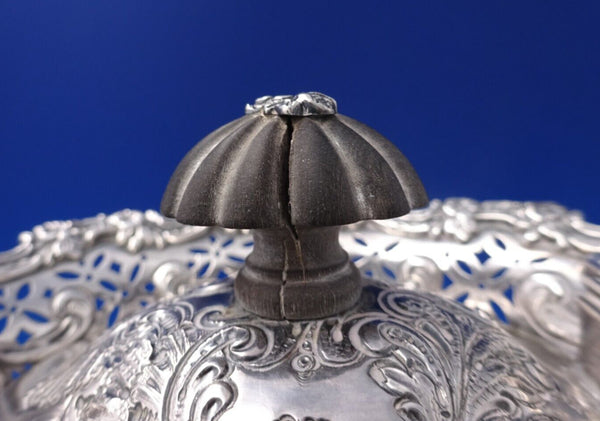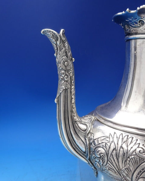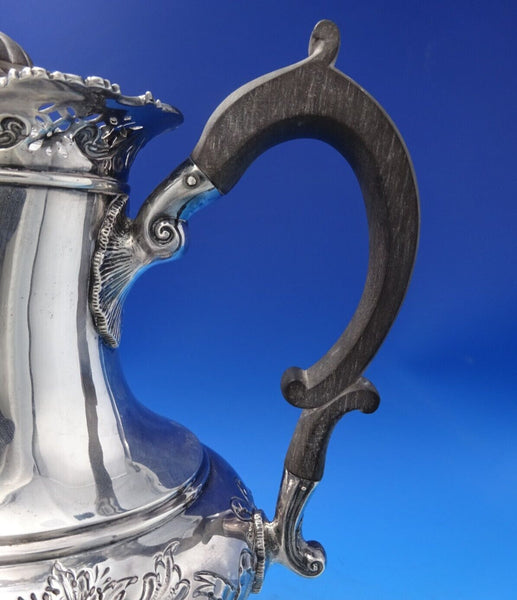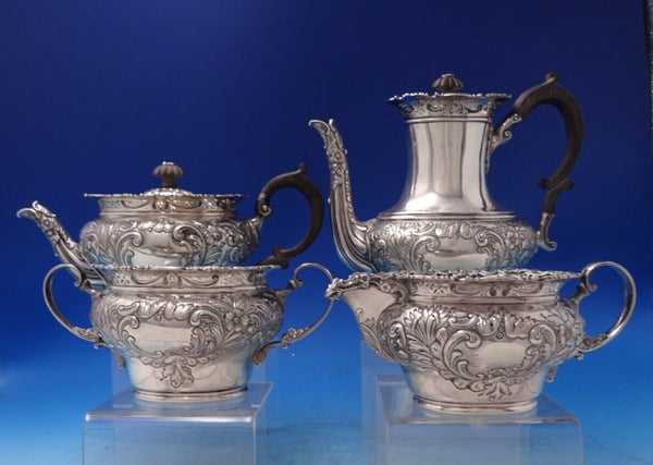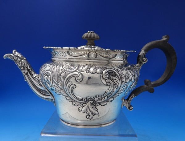Superb Robert Hendery Canadian sterling silver four-piece tea set with chased flowers and grasses and rococo design. This set also features ebony wood handles and finials. It was retailed by Birks. This set includes: