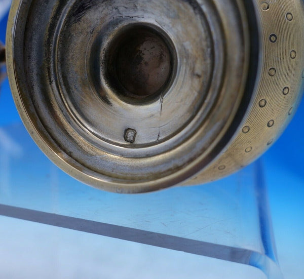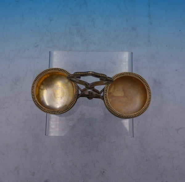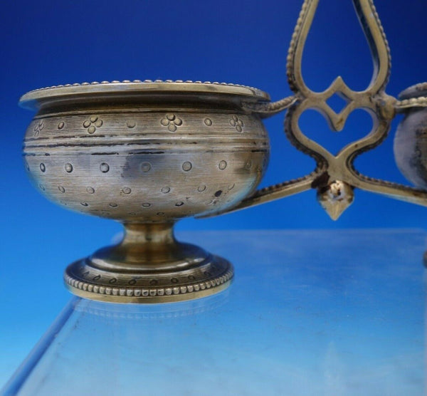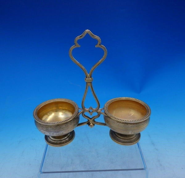 Wonderful French .950 silver master salt caddy with two vermeil bowls (maker unknown). This piece features a cast handle, beaded rim, and engraved lines and dots pattern.