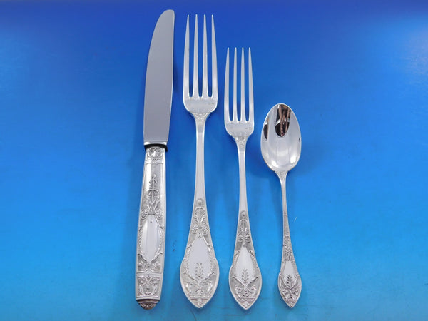 Dinner Size Renaissance by Plasait Orfevres (French) sterling silver flatware set, 72 pieces. This set features daffodils, plumes, and mythological griffins on a textured background around an open central cartouche. This set includes: