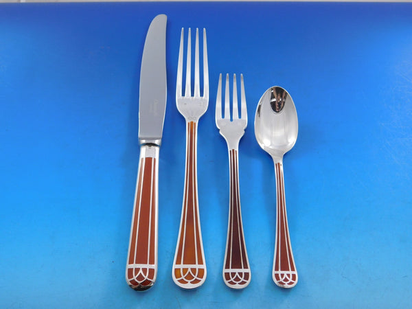 This Art Deco style model was created in 1986 by the designer Bernard Yot (born in 1944) for Christofle. Christofle begins the process by stamping the flatware in the chosen metal. After sandblasting, lacquer is applied in an 18-step process by hand. This tedious and careful process