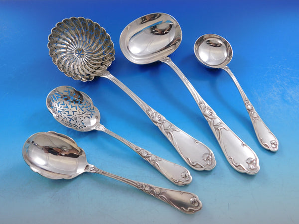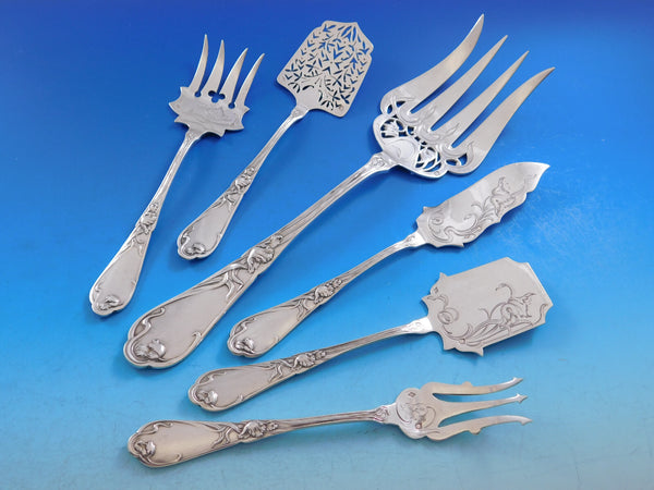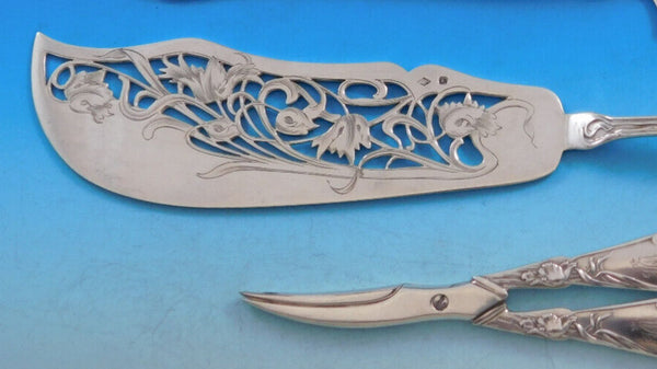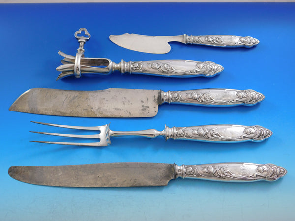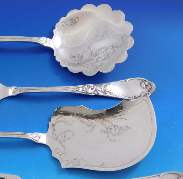 Superb monumental Art Nouveau "Tulipe AKA Tulip" by Boulenger French 950 Silver Flatware set - 214 pieces, circa 1899-1903. This set includes:24 Large Dinner Size Knives, pointed, 10 1/4"24 Dinner Size Forks, 8 1/2"12 Dessert Knives, hollow handle all-sterling, 8 1/8"12 Dessert Forks, 7 3/8"12 Teaspoons, 5 3/4"12 Dessert Spoons, 7 3/8"11 Hollow Handle Butter Spreaders, 6"12 Large Dinner Spoons, 8 1/2"12 Fish Knives, flat handle all-sterling, with acid etched blades, 8 3/4"12 Fish Forks, flat handle all-sterling, with acid etched tines, 7 1/4"12 Pastry Forks, 3-tine, 6"12 Oyster Forks, 5 3/8"12 Ice Cream Spoons with brite-cut flowers in bowl, 5 1/2"6 Egg Spoons, 5 1/2"1 Gravy Ladle, 8"1 Sugar Spoon, 6"1 Flat Handle Master Butter, with acid etched blade, 6 3/4"1 Pickle Fork, 6"1 Tomato Server w/acid etched flowers, 9"1 Long Salad Serving Set, flat handle all-sterling, 10"1 Sauce Ladle, 5 3/4"1 Roast Carving Set, 2-pc, 13" 11 1/4"1 Bone Holder, 8 1/2"1 Soup Ladle, 13 1/2"1 Sandwich or Asparagus Tongs, beautifully pierced with flowers and acid etched, 8 3/8"1 Ice Cream Server, flat handle all-sterling, 10"1 Ice Cream Slice Hollow handle w/stainless blade, 12 1/2"1 Cheese Knife with plated blade, 8"1 Bouillon Ladle with spout, 10"1 Fish Server, flat handle all-sterling, beautifully pierced with flowers, 11 3/4"1 Fish Serving Fork, flat handle all-sterling, pierced with flowers, 9 1/4"1 Aspic Slice, flat handle all-sterling w/acid etched flowers, 11 1/4"1 Ice Tong, 6 1/2"1 Beef Fork w/acid etched flowers, 6"1 Berry Spoon w/acid etched flowers, 8 1/2"1 Pea Spoon, 8 1/4"1 Petit Four Server w/acid etched flowers, 6"1 Petit Four Server, pierced, 6"1 Sugar Sifter, 6"1 Grape Shears, all-sterling, 6 1/2" Includes bonus brand new storage chest - styles vary.Excellent condition, some wear to the steel blades/tines of the carving pieces and the Ice cream slice (as shown), as expected with age. Matching period monogram. This set will be lightly polished and sealed in individual plastic sleeves prior to