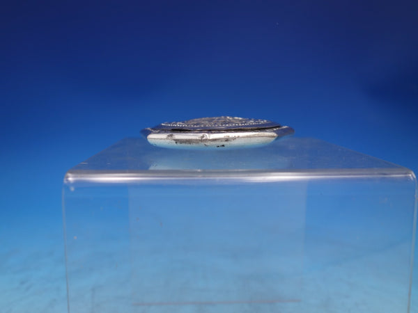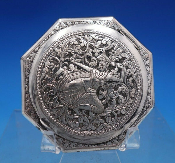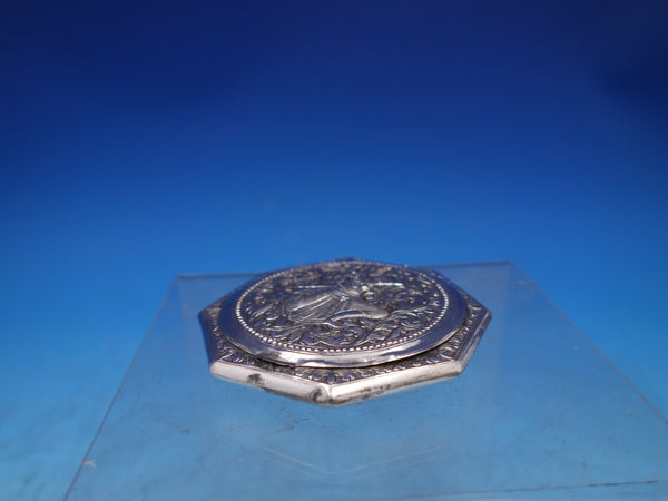 Wonderful Middle Eastern sterling silver compact with mirror featuring a chased figural design and scrollwork. This piece measures 3" tall x 3" in diameter. It is not monogrammed and is in good vintage condition. Exceptional!