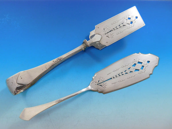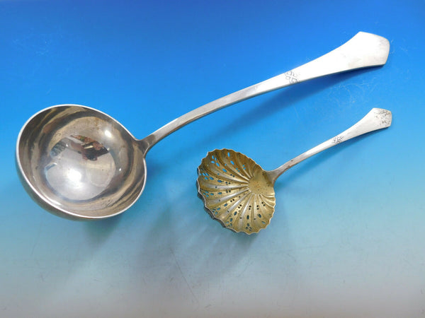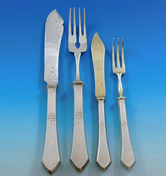 10 Demitasse Spoons, 3 7/8"10 Ice Cream Shovels, gold-washed, 5 1/8"10 Sherbet Spoons, gold-washed, 5 5/8"10 Large Diner Spoons, 8 1/4"10 Egg Spoons, gold-washed, 4 5/8"10 Fish Knives, hollow handle all-sterling, bright-cut, 8 5/8"10 Fish Forks, hollow handle all-sterling, bright-cut, 8 1/4"10 Fruit Forks, hollow handle all-sterling, gold-washed, 6 1/4"10 Fruit Knives,hollow handle all-sterling, gold-washed, 7"4 Master Salt Spoons, 3 3/8"1 Asparagus Serving Tong, yolked, bright-cut, 10 1/4" (impressive!)1 Ice Tong, 5 5/8"1 Oyster Ladle, 9"1 Cheese Knife 8 3/8"1 Cheese Server, 8 1/4"1 Gravy Ladle, 7 3/4"1 Cake Server, bright-cut, 11 1/8"1 Soup Ladle, 12 1/2"1 Fish Serving Set, 2-pc, bright-cut, 11" 10"