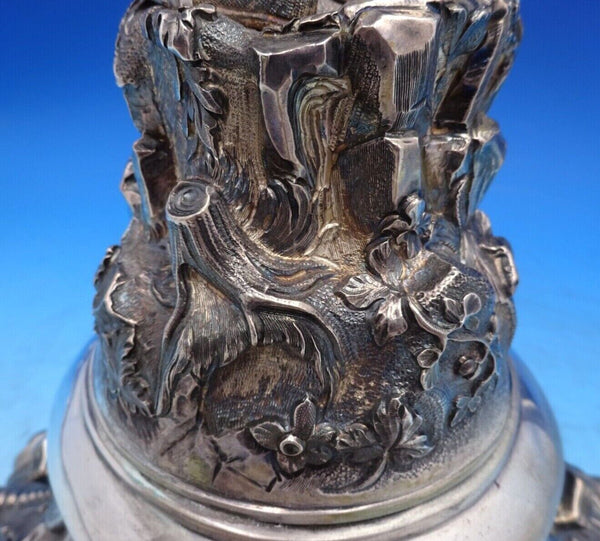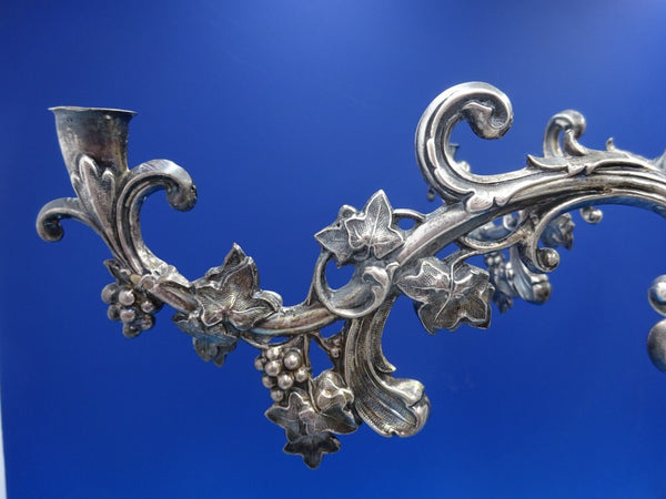 Incredible Austrian .800 silver 6-light candelabra / epergne from Vienna, Austria (maker unknown). This massive piece features a three dimensional man holding an axe on a rocky base with lizard and foliage. This piece does not include candle cups or bowls. It is hand engraved and engine turned with leaves on base. There are lead repairs to arms. This piece measures 24 3/4" tall x 18" and weighs 87.9 troy ounces. It is monogrammed and in good vintage condition (with repair as noted). Lovely!