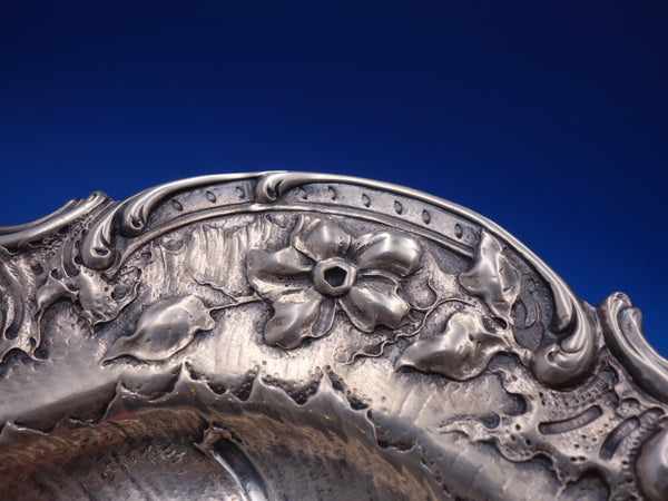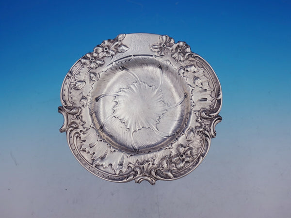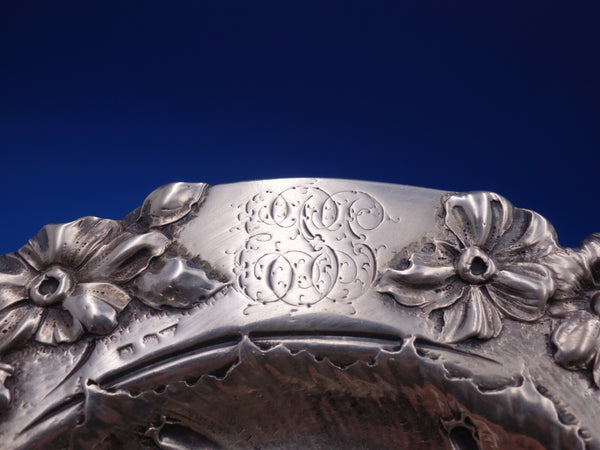 Belgian Silver monogrammed Art Nouveau repoussed and chased flowers plate by Wolfers Brothers. It measures 5/8" x 6 1/2" diameter and weighs 5.41 ozt. It is monogrammed as noted (see photo) and is in good vintage condition. Beautiful piece!