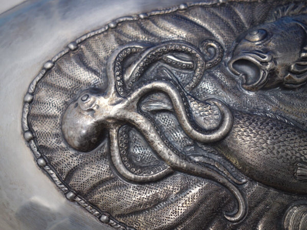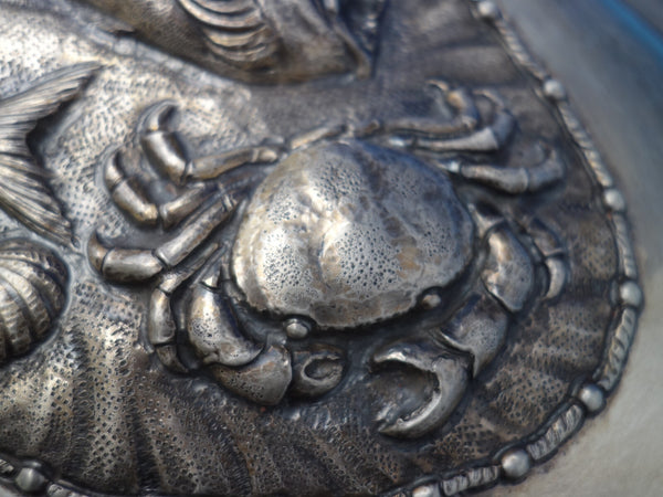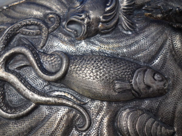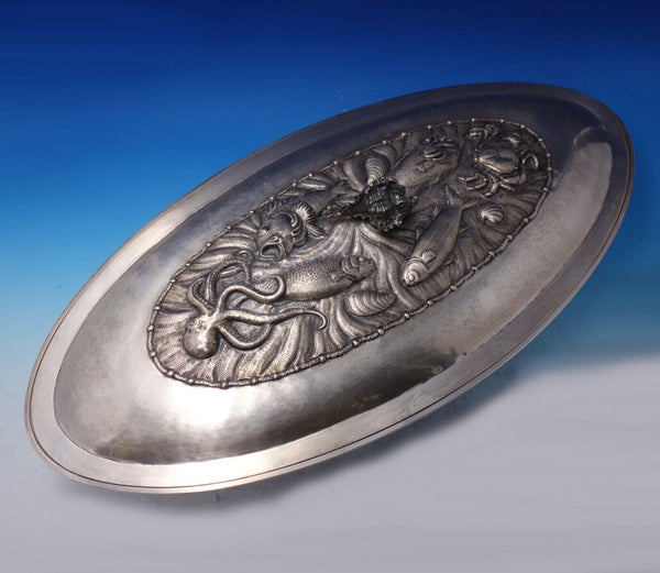 Extraordinary Carlo Foglia Italian .800 silver handmade two-piece fish serving platter, circa 1935. This platter features a cover with repoussed sea life including octopus, four different fish, crab, and seashells, and has a 3-D cast seashell handle.