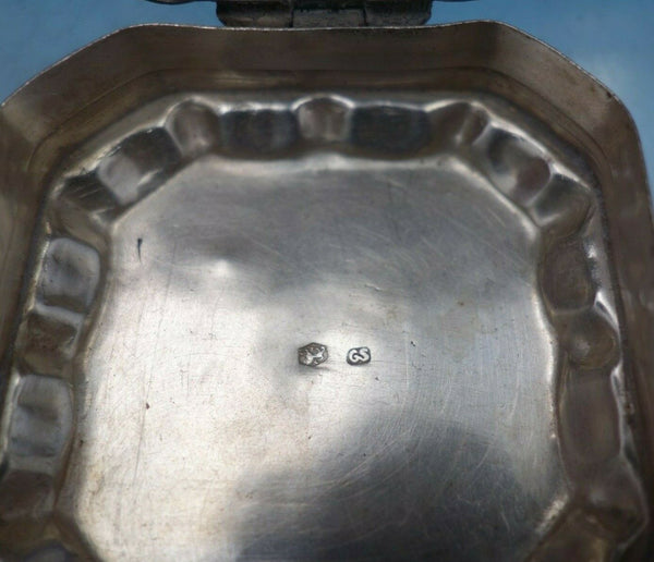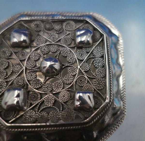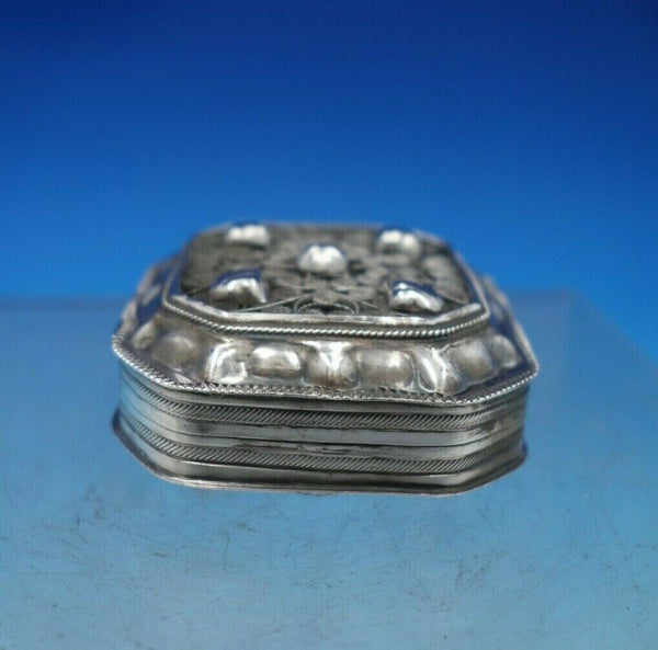 Beautiful Dutch .833 silver box with applied filigree on lid (maker unknown). This box measures 1" tall x 2 1/8" and weighs 1.4 troy ounces. It is not monogrammed. This piece is being offered in as-is condition due to a tear near the hinge (see photos). Wonderful piece!