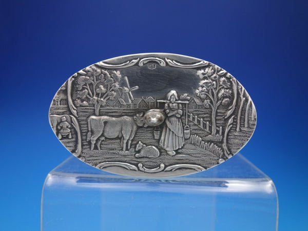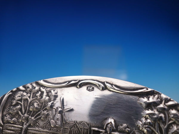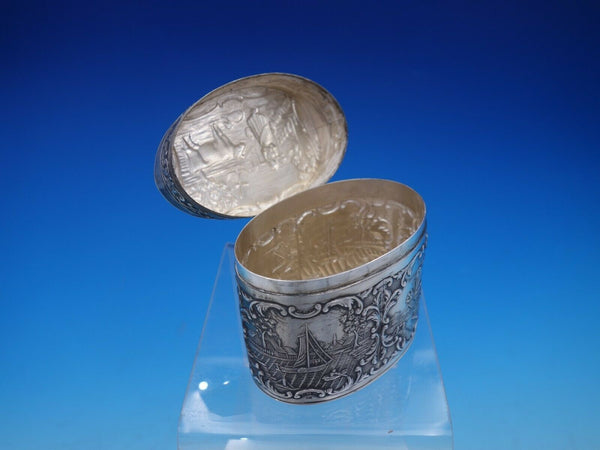 Dutch Silver by various makers tea caddy with windmill, boat, and figural scenes along with a finial top lid. It measures 3 1/2" x 3 1/8" and weighs 4.8 ozt. It is not monogrammed and is in good vintage condition with minimal signs of wear. Beautiful item!