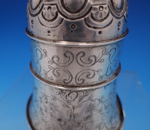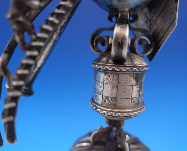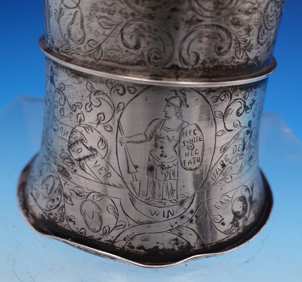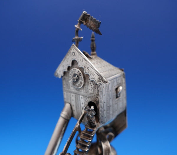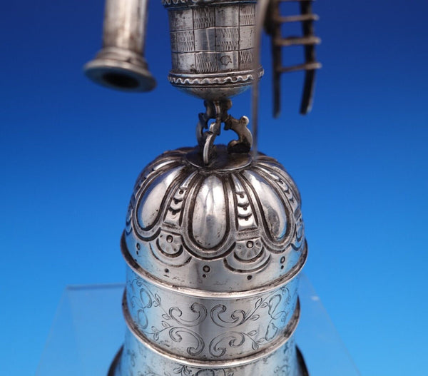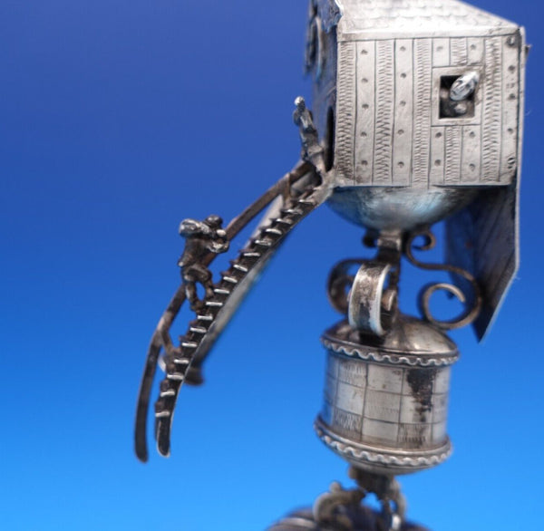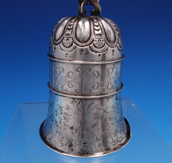 Extraordinary Dutch sterling silver bell 8 3/4" weighing 13 troy ounces (maker unknown). This piece features a 3-D handmade clock tower with steps and three men. This bell is hand engraved with a man holding a shield which reads "Nec Sorte Nec Fato", which is Latin for "Neither By Chance Nor Fate" (see photos).