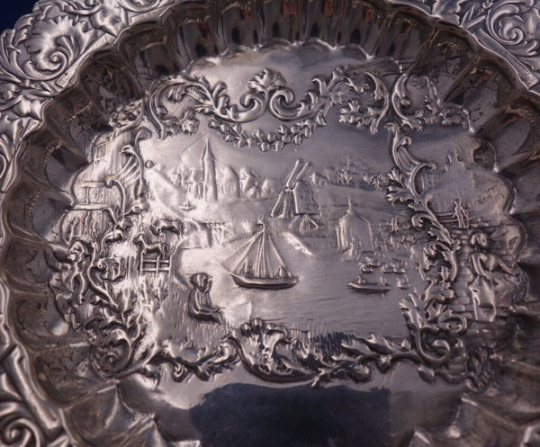 Remarkable Dutch sterling silver candy dish featuring a harbor scene with boats and windmill, with three ball feet on the bottom (maker unknown). This dish measures 1/2" tall x 4 3/4" in diameter and weighs 1.88 troy ounces. It is not monogrammed and is in good vintage condition. Fabulous!