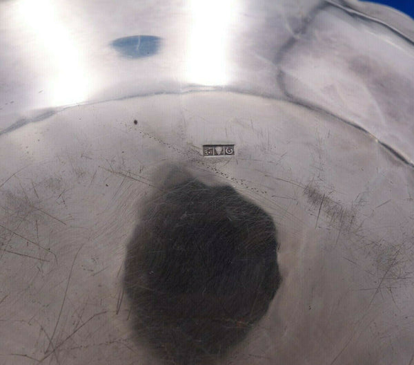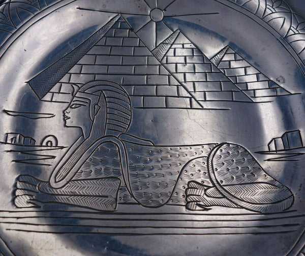 Plate that is Egyptian .800-.900 silver with hand engraved pyramid and sphinx (maker unknown). It has a scalloped border with lotus. The plate measures 3/8" x 6 3/4" in diameter and weighs 4.5 troy ounces. It is not monogrammed and is in good vintage condition with some minor dings. Captivating piece!