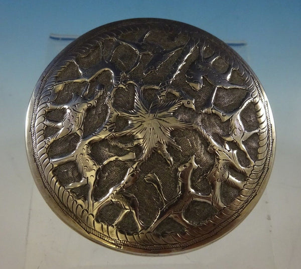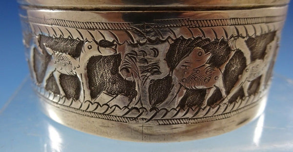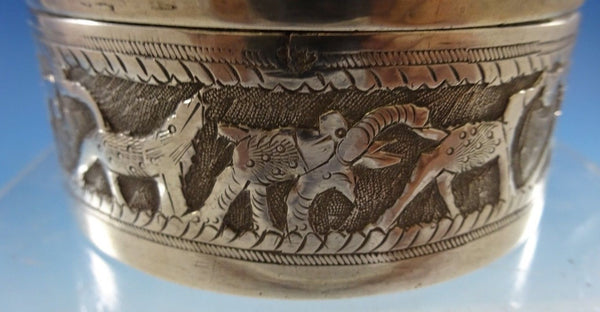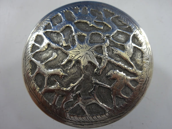 Beautiful India .800 round box with circling elephants and other animals. The piece measures 3" in diameter x 1 1/2" tall and weighs 4.2 troy ounces. It is not monogrammed and is in excellent condition. Wonderful!