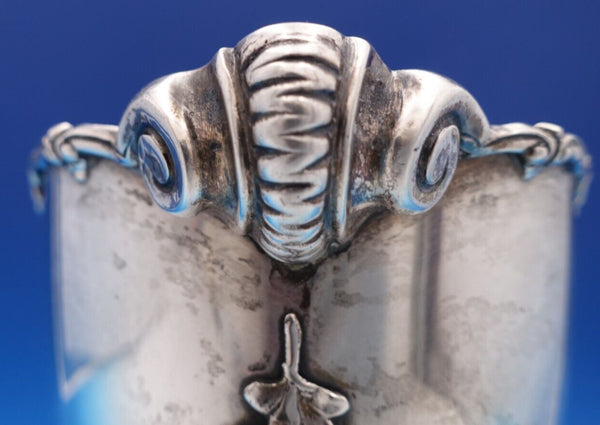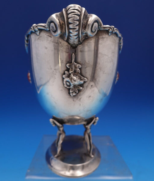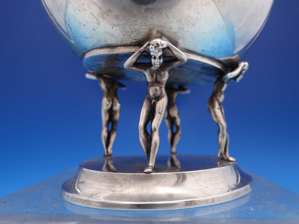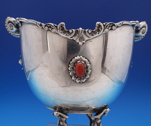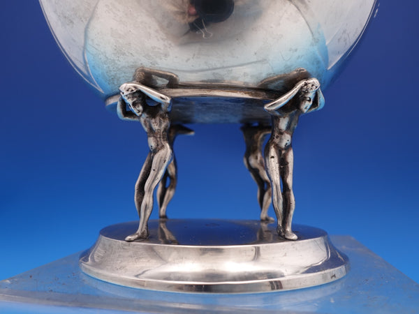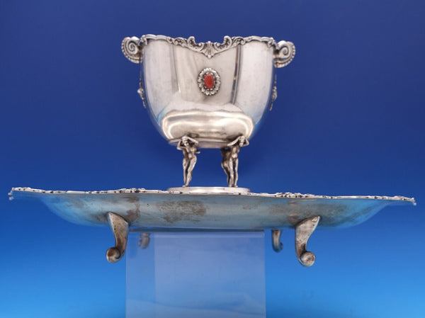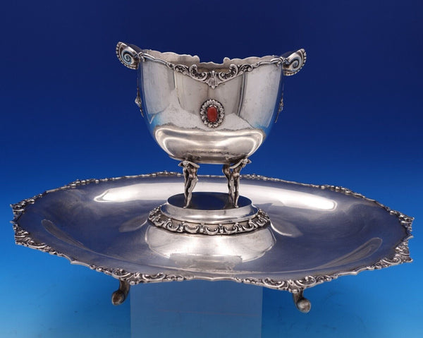 Remarkable Italian .800 silver caviar bowl with ice tray (maker unknown). This piece features four figural 3-D giants and two amber stones (see photos). The bowl measures 6 5/8" tall x 7", the ice tray measures 15" (length) x 12 1/2" (width), and altogether it weighs 47 troy ounces. This piece is not monogrammed and is in good estate condition as shown. Spectacular!