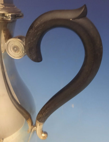 Simply beautiful 3-piece tea set made by Jezler of Switzerland. It is 800/1000 or 80% silver and is numbered #1614. It features ebony handles and finial with applied feet. The set dates from the 1960's. The set includes:Coffee Pot: Measures 10 1/2" tall, 7 3/4" wide, and it weighs 21.6 ozt.