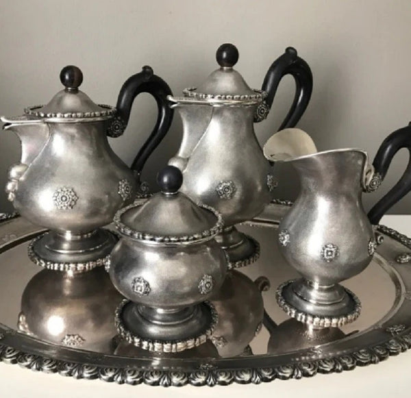 Fabulous Mario Buccellati, Italy 800 silver tea set of five pieces with "Segrinato" finish, beautiful rosettes "con Rosoni "and ebony handles, circa 1960s. This exceptional tea service includes: