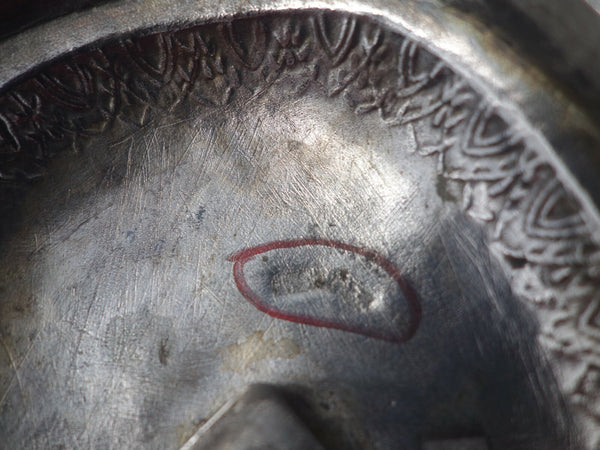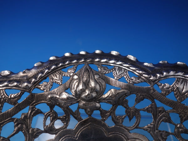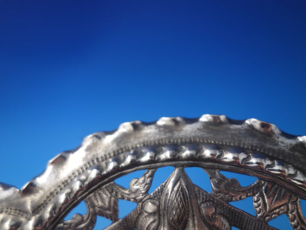 Lovely Middle Eastern sterling silver oval compote with swing handle (maker unknown). This piece features a pierced boarder and lovely hand engraved detailing. It measures 6 1/2" tall (with handle) x 2 3/4" tall (without handle) x 8 1/4" x 6" and weighs 8.08 troy ounces. It is not monogrammed and is in good vintage condition. Beautiful!