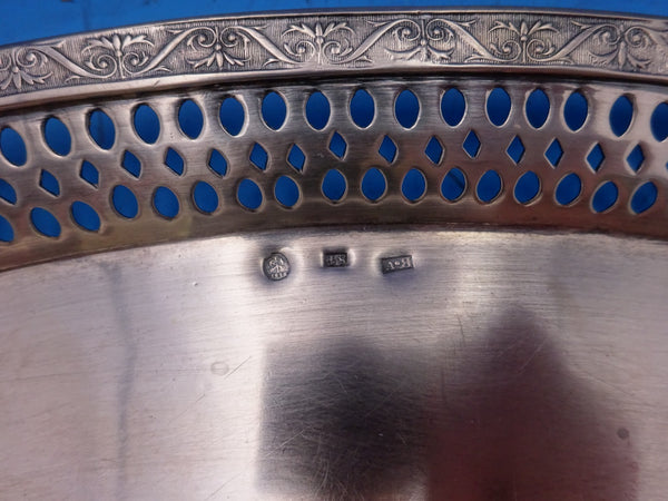 Beautiful Russian 84 (.875) silver tea tray made in St. Petersburg circa 1795-1826 (date mark hard to read, possibly 1816), assayed by A. Yashinkov. Maker unknown. This piece features an applied border and has oak leaves and acorns by the handles. It is also pierced and has hand engraved leaves and vines.