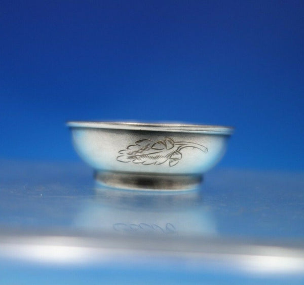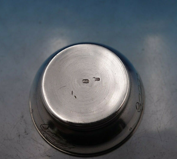 Beautiful Russian .875 silver salt cellar with gold washed interior and engraved leaves (maker unknown). This piece measures 1/2" tall x 1 3/4" and weighs .34 troy ounces. It is in good vintage condition as shown in the photos. Superb!