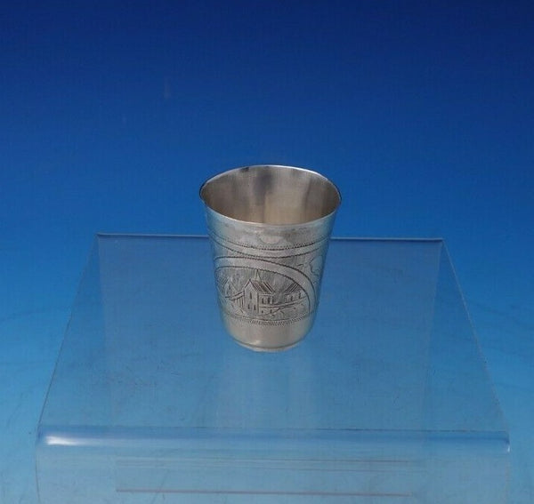 Superb Russian .875 silver shot glass marked #84 featuring a bright-cut church (maker unknown). This piece measures 1 3/4" tall x 1 5/8" and weighs 0.7 troy ounces. It is not monogrammed and is in good vintage condition. Wonderful!