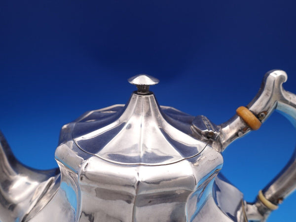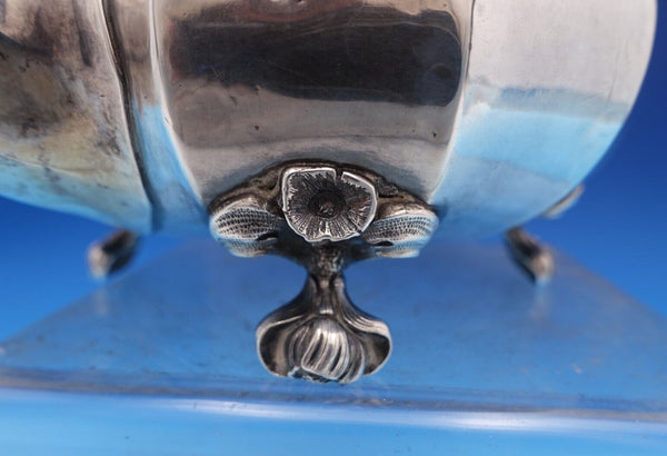Amazing Russian .875 silver tea pot featuring applied flowers and leaf feet, made in St. Petersburg circa 1860s ("IW" makers mark/date worn). This piece measures 5 1/2" tall x 8 1/2" and weighs 18.7 troy ounces. It is not monogrammed and is in good estate condition as shown with some minor dings. Please note that the insulator looks replaced. Terrific piece!