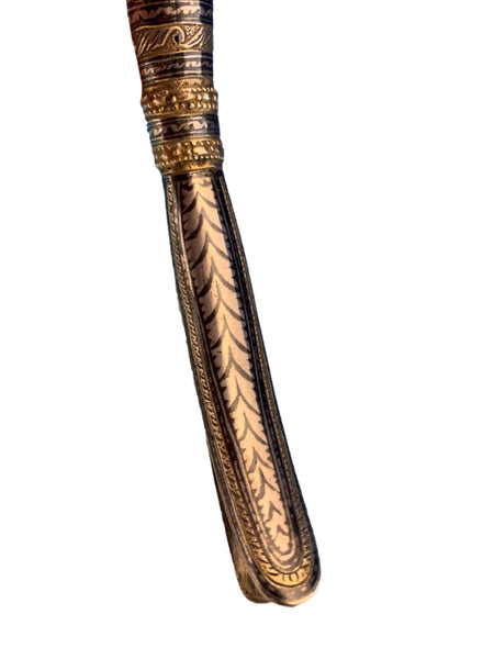 Remarkable Russian niello and gilt silver tussie mussie or posy holder. It is fully hallmarked for 84 silver which is 875/1000. It has turquoise eyes on a serpent/crocodile handle. Beautifully hand engraved with flowers and scrollwork. It measures a large 7 1/4" long and weighs a substantial 2.5 troy ounces. It dates from the 1890s. There is a crack on the underside. Terrific piece!