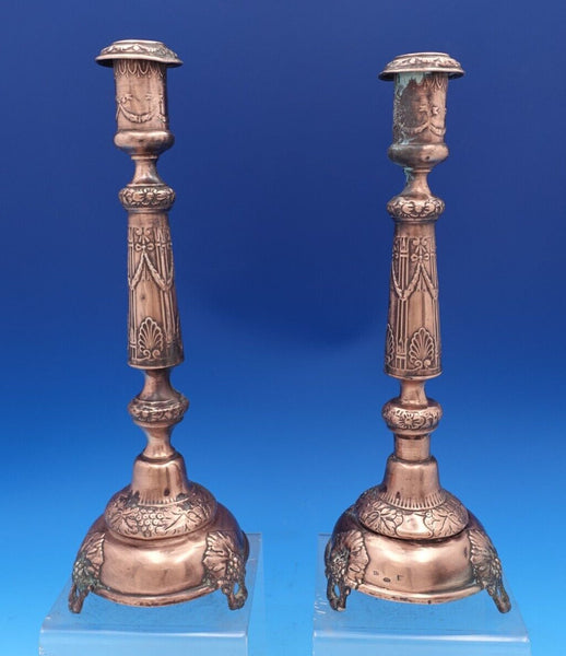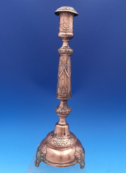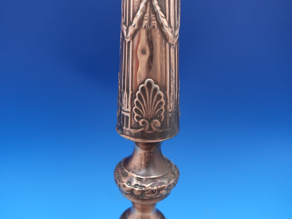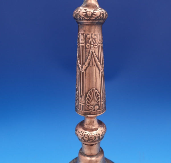 Remarkable Russian silver candlestick pair featuring swags and ribbons, circa 1890 (maker unknown). These pieces were copper plated to avoid confiscation when escaping Russia.