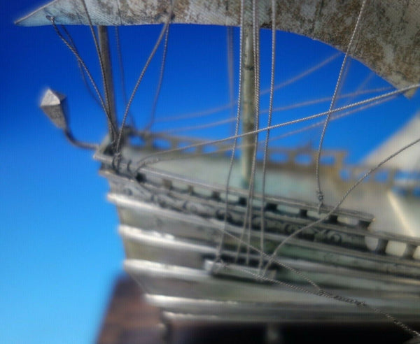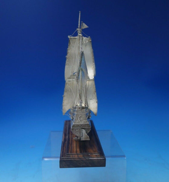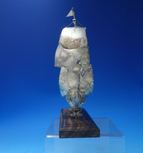 Remarkable Danish .833 silver sculpture of a ship with three masts and sails, including silver wire for ropes and a wood base, circa 1931 (maker unknown). This piece measures 8" tall, and the wood base is 7" x 2 1/2". This piece is not monogrammed and is in good vintage condition as shown in the photos. Absolutely fantastic!