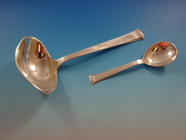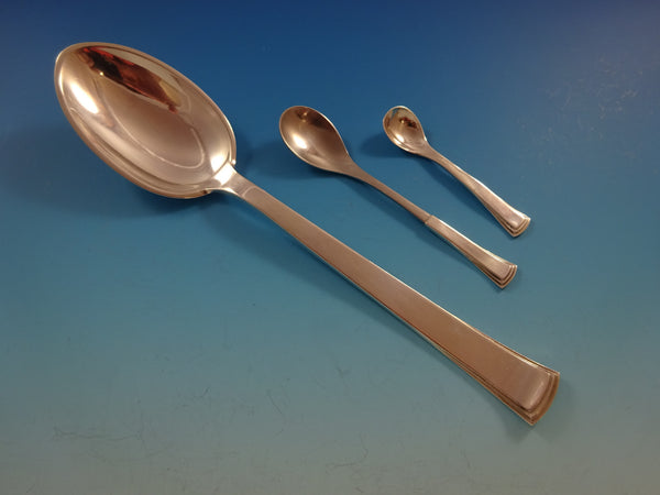 This set includes:6 DINNER KNIVES, (4- 8 5/8", 2- 8 7/8") 6 DINNER FORKS, 8 1/8" 6 SMALL TEASPOONS, 5 1/4" 7 DESSERT SPOONS, 6 3/4" 6 FRUIT KNIVES, 6 7/8" 6 DEMITASSE SPOONS, 4 1/2" 7 DESSERT FORKS, 6 7/8" 6 DESSERT KNIVES, 7 7/8" 6 PASTRY FORKS, 3-TINE, 5 5/8" 3 DINNER SPOONS, 8" 2 COLD CUT FORKS, 2-TINE, 5 7/8" 1 VEGETABLE SERVING SPOON, OVOID, LARGE, 10 5/8" 1 BERRY SPOON, 9 3/8" 1 BERRY SPOON, SMALL, 7 7/8" 2 GRAVY LADLES, 6 7/8" 1 PEA SPOON, LARGE WIDE BOWL, 9 3/8" 1 COLD MEAT FORK, 2-TINE, 7 1/2" 1 PASTRY SERVER, 6 1/4" 1 SAUCE SPOON, 6 1/4" 1 BOTTLE OPENER W/STAINLESS, 4 5/8" 1 TEA CADDY, 4 3/4" 1 MUSTARD SPOON W/STAINLESS, 4 1/8" 1 PRESERVE SPOON, 7" 4 SALT SPOONS, 2 3/4" Includes bonus brand new storage chest - styles vary.