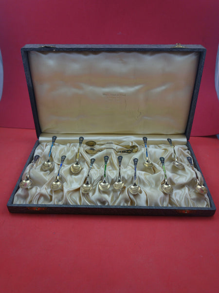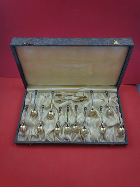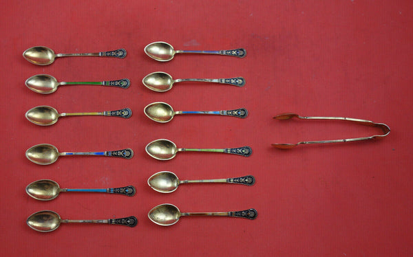 Estate Norwegian enameled gold-washed sterling silver 13-piece Coffee spoon set original box, retailed by Gorham.
