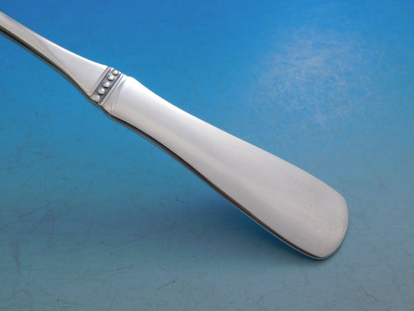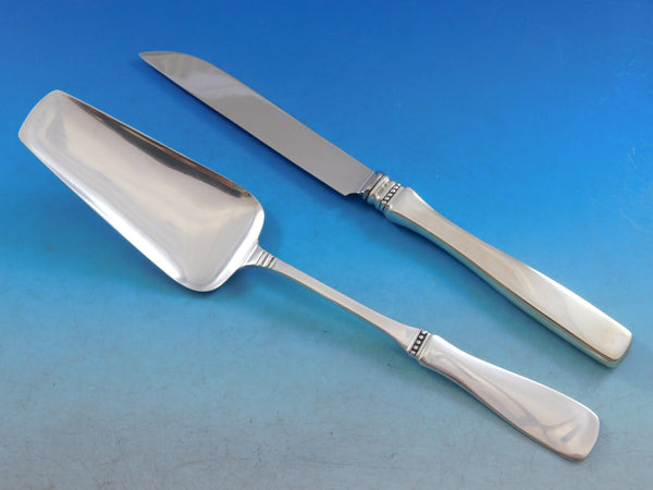 Lovely Uppsala by Mema, designed by Eric Lofman, Swedish 830 Silver Flatware set with bead detailing - 82 pieces. This set includes:10 Knives w/stainless blades, 8 3/8"10 Forks, 6 5/8"10 Salad Forks, 6"10 Small Teaspoons, 4 3/4"10 Cream Soup Spoons, 6 5/8"10 Coffee Spoons, 3 7/8"10 Dessert Knives w/stainless blades, 7 1/4"1 Gravy Ladle, Double spout, 7 1/2"3 Sugar Spoons, 6"2 Hollow Handle Master Butter Knives w/stainless blades, 6 1/2"1 Pastry Server, 9 1/8"4 Serving Spoons, 8 1/8"1 Cake Knife w/stainless blade, 8"Includes bonus brand new storage chest - styles vary.