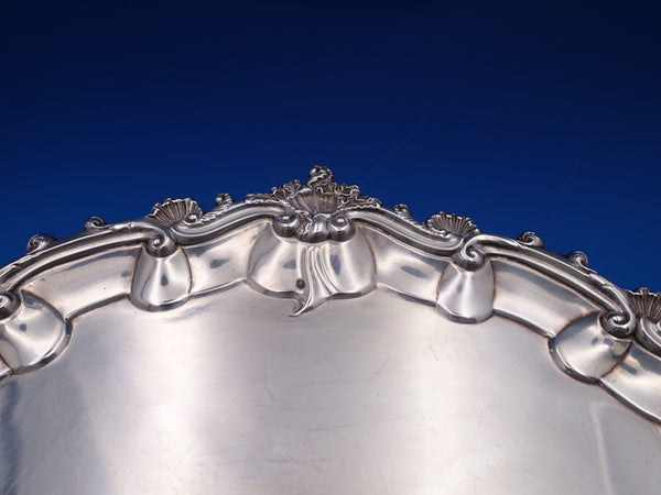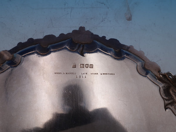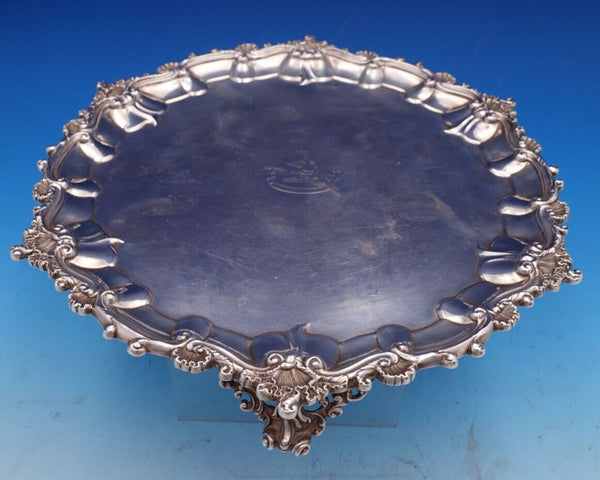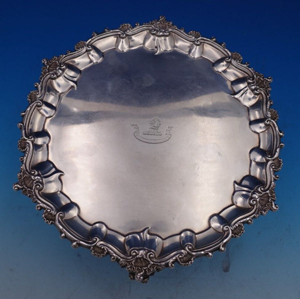 This piece features a scalloped shell border and three cast feet. The tray measures 11" in diameter and weighs 23.25 troy ounces. It has an engraved family crest in the center with ribbon "Manners Makyth Man" (see photos), and it is in good estate condition as shown. Pretty piece!