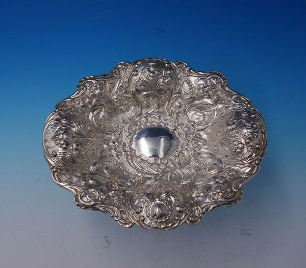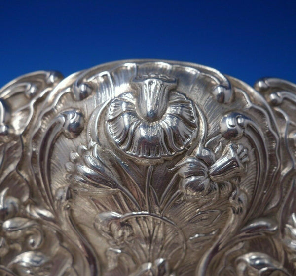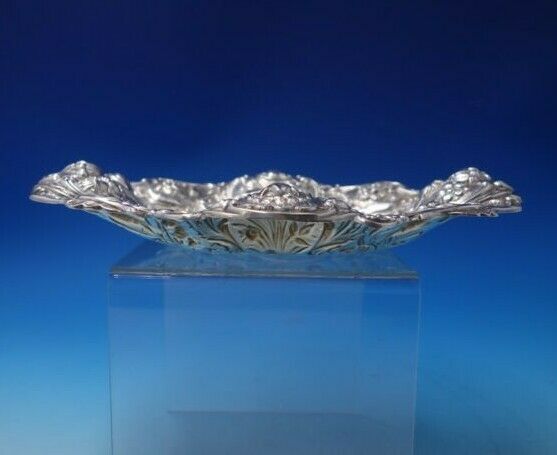 Lovely Art Nouveau by William Comyns and Sons sterling silver serving tray with flowers and buds. This piece was made in London with a date stamp for 1907. The tray measures 1" (h) x 9 3/4" (l) x 7 3/4" (w) and weighs 6.7 troy ounces. It is not monogrammed and is in good vintage condition. Spectacular!