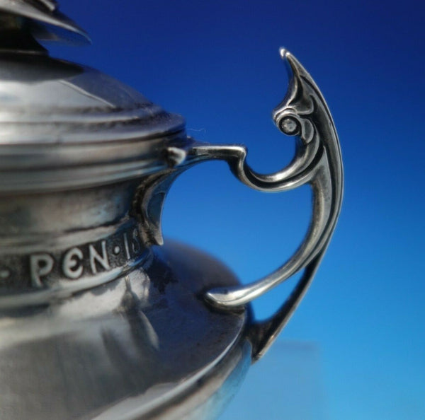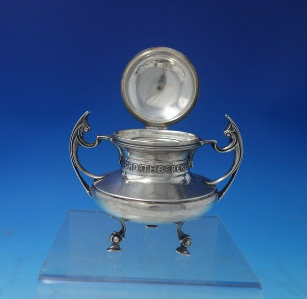 Amazing B and Shield sterling silver inkwell with Art Deco style insect handles. This piece measures 4" tall x 4 1/4" and weighs 7.5 troy ounces. It has wording around the center, "The Pen Is Mightier Than The Sword" (see photos), and is in good vintage condition. Remarkable!