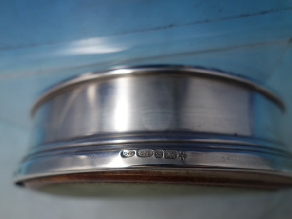 English sterling silver champagne coaster with wood base by B Co. This piece measures 1 1/4" tall x 4 1/2" diameter. It is not monogrammed and is in good vintage condition. Lovely!