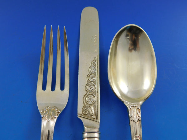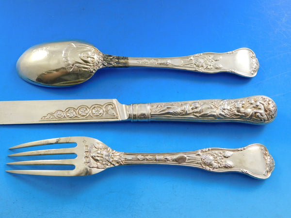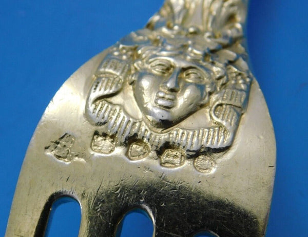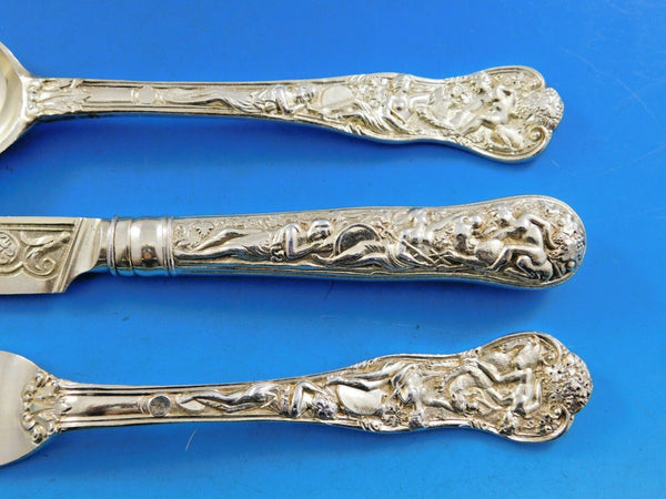 Superb Bacchanalian (unknown maker) English vermeil lightly gold-washed figural multi-motif sterling silver flatware set, 12 pieces. This set includes: