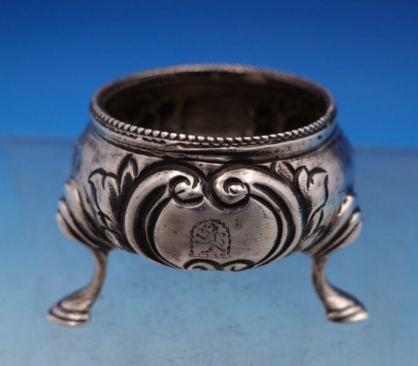Superb Charles Boyton English Victorian sterling silver footed salt cellar made in London circa 1845. This piece features repoussed flowers and cartouche with engraved lion. This salt cellar measures 1 1/4" tall x 1 5/8". It is in good estate condition as shown in the photos. Outstanding!