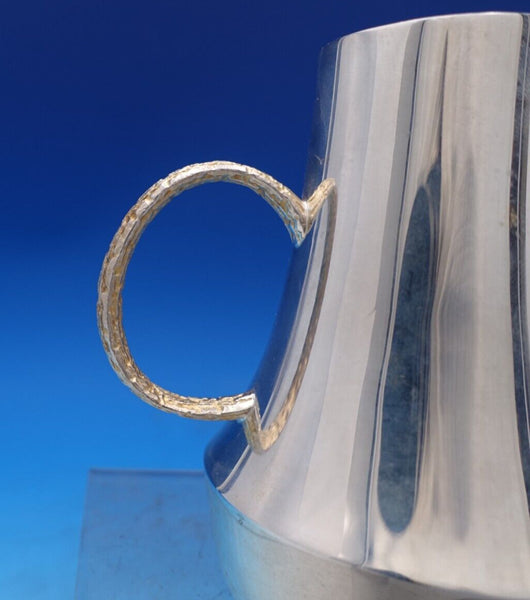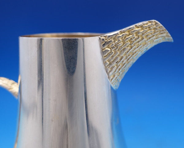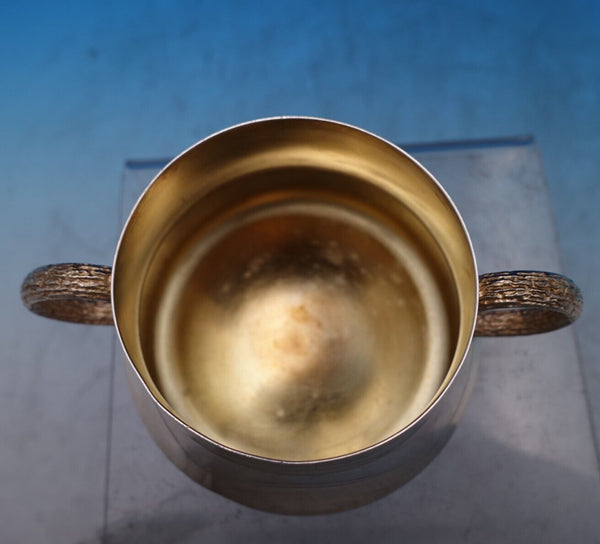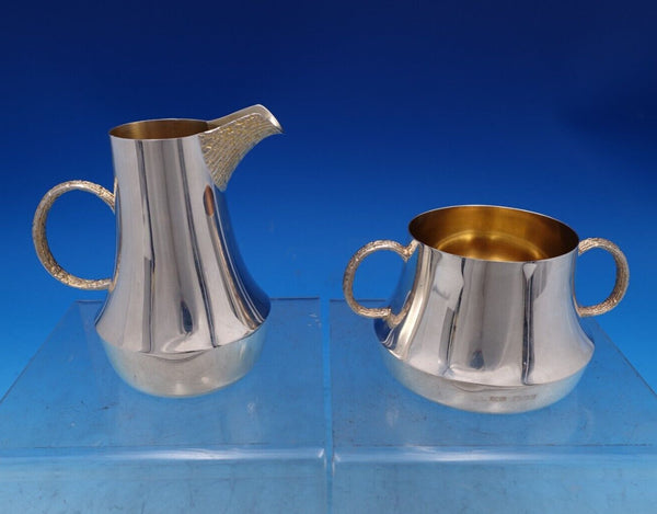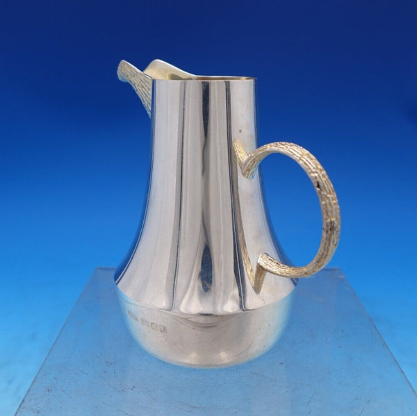 Captivating Christopher Nigel Lawrence English estate sterling silver sugar and creamer two-piece set made in London, England, circa 1984. The pieces have a gold washed interior and there is a bark texture on the handles and spout. The sugar measures 2 1/2" tall, and the creamer measures 4" tall. Together the pieces weigh 8.86 troy ounces. They are not monogrammed and are in good estate condition as shown in the photos. Terrific!