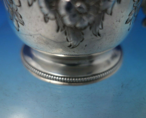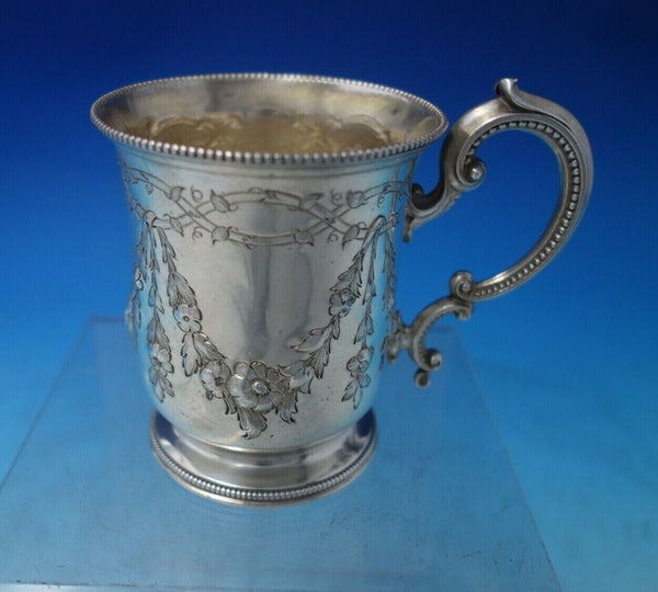 Charming Edward and John Barnard sterling silver baby cup featuring chased flowers and swags made in London circa 1864. This cup measures 3 3/8" tall x 3" in diameter at the top, and weighs 5.27 troy ounces. It is not monogrammed and is in good vintage condition. Fantastic!