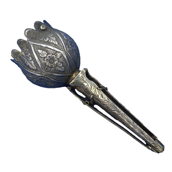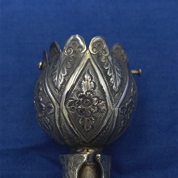 Sterling tussie mussie hallmarked for London in 1867 by Thomas Smily. The tussie is hand chased and engraved with flowers and leaves. The flower shaped cup has a scalloped rim. There are three partial gilt legs connected with chains to stand as a tripod. It measures 4 1/2" long and 1 3/8" diameter of the cup. Very good condition. There are two pins for holding flowers in the cup. Fantastic piece!