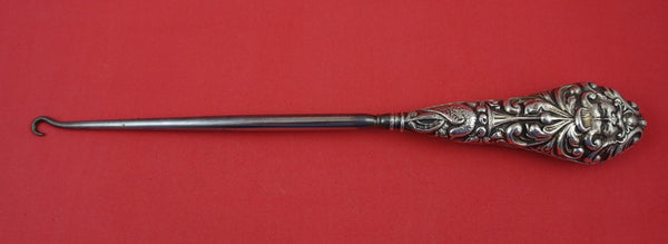 English estate sterling silver Button Hook with figural bird and face. Some dents and a hole implement is steel, Birmingham 1903 by WJH = William J. Holmes 10 3/4". It is not monogrammed and is in good condition.