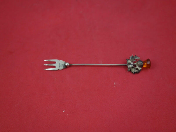 English estate sterling silver Cocktail Fork Birmingham 1920 by ALLD = Adie and Lorekin Ltd with 3-D thistle with yellow glass stone 4 3/4", (maker unknown). It is not monogrammed and is in excellent condition.