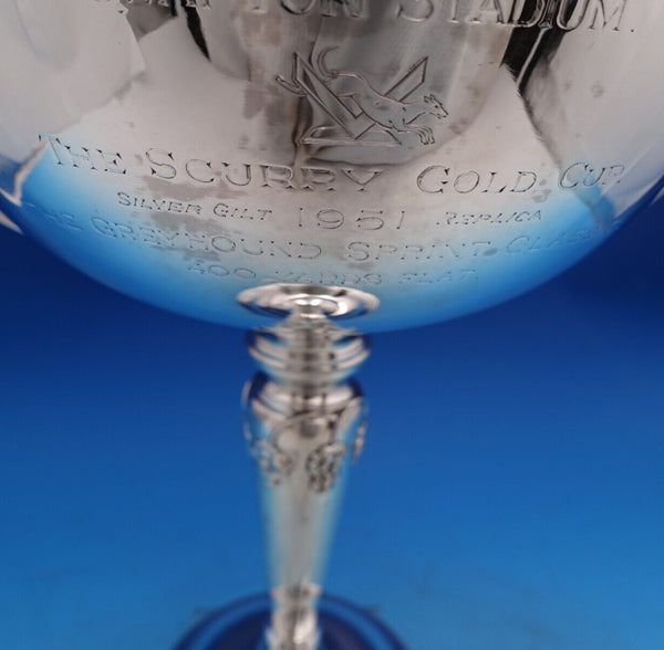There is a presentation engraving that reads, "Presented by Clapton Stadium The Scurry Gold Cup Silver Gilt 1951 Replica The Greyhound Sprint Classic 400 Yards Flat" (see photos). This piece is in good estate condition as shown in the photos. Remarkable!