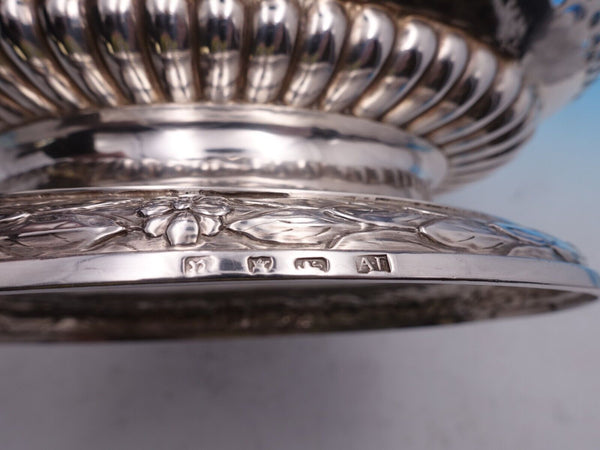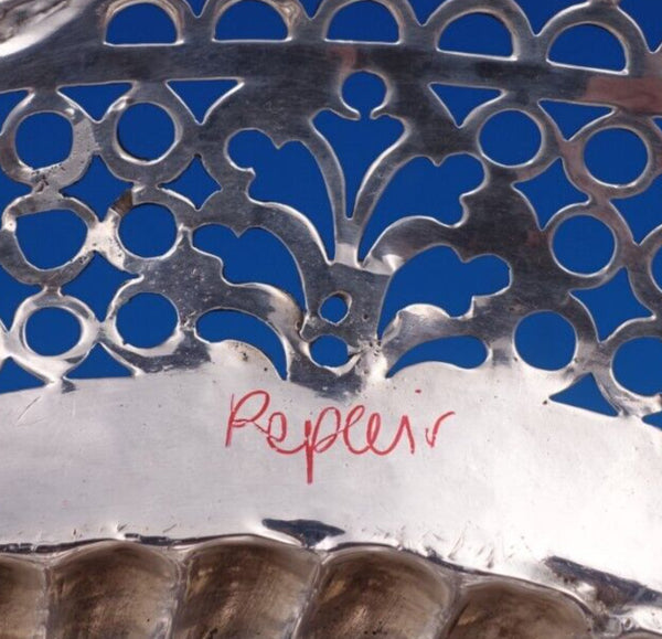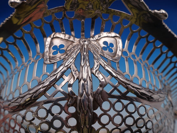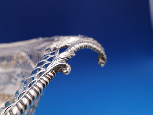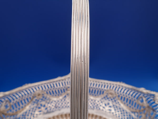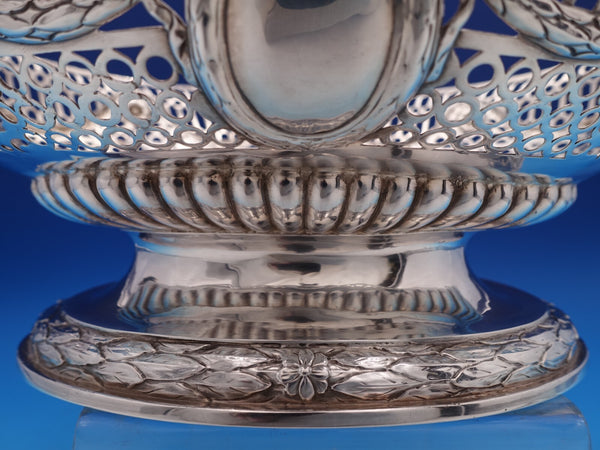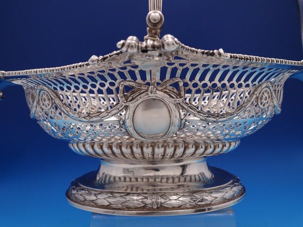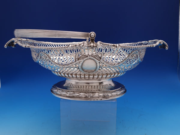 Incredible Georgian English large sterling silver footed basket with swing handle featuring a hand pierced body, gorgeous ribbons and swags, rosettes, and shell detailing, stamped for London, 1772, by Andrew Fogelberg. It measures 15 3/4" l x 12" w x 13" to top of handle (5" tall to rim). It weighs 34.2 troy ounces. This is a perfect bride's basket or fruit basket. It is not monogrammed and is in good vintage condition with some minor old repairs. Truly superb!