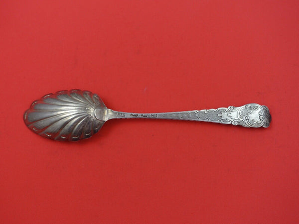 English Georgian sterling silver Berry Spoon, gold washed shell bowl, engraved lion walking through trees, 8 1/2". It is monogrammed (monos vary) and is in excellent condition.